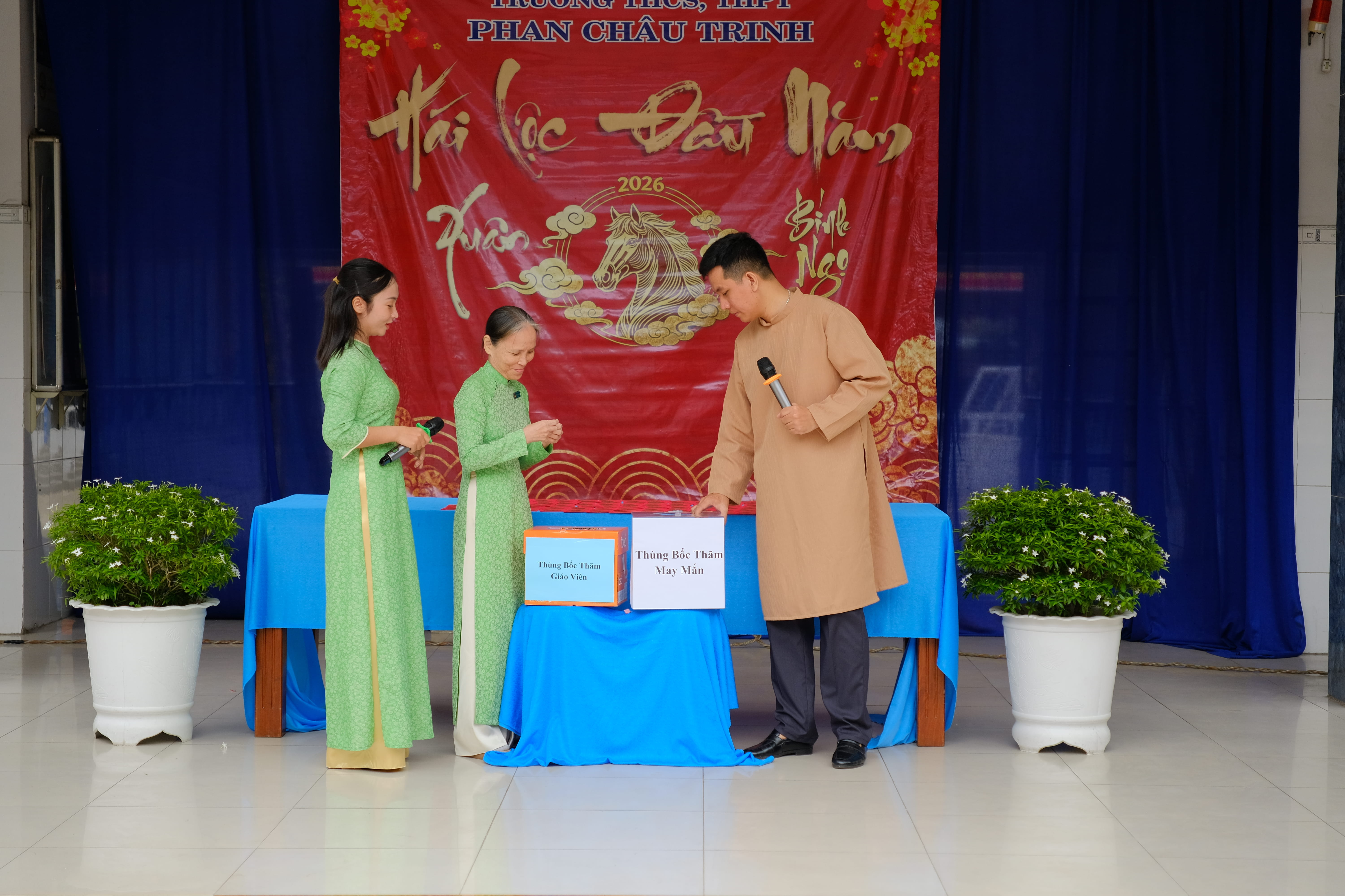 Đầu xuân năm 2026, không khí rộn ràng bao trùm sân trường THCS, THPT Phan Châu Trinh trong buổi hái lộc đầu năm đầy ý nghĩa. Những cành lộc non tươi tốt được trang trọng treo trên cây nêu như lời chúc may mắn gửi đến tập thể sư phạm và học sinh. Điều đặc biệt là người được hái lộc sẽ do ban tổ chức tiến hành rút thăm may mắn, tạo nên sự hồi hộp và thích thú cho tất cả mọi người. Khi tên từng giáo viên và học sinh được xướng lên, những tràng pháo tay và tiếng cười giòn tan vang khắp không gian. Những cành lộc xanh tươi được trao đi mang theo bao ước vọng về một năm mới an lành, may mắn và thành công rực rỡ.
